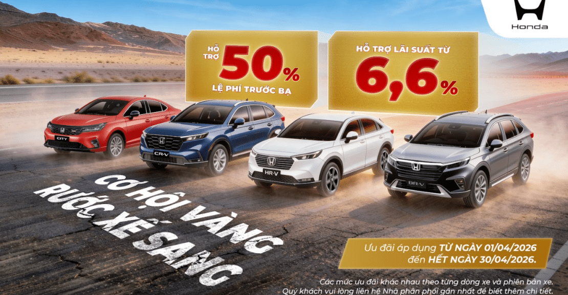 Với mong muốn mang đến nhiều hơn nữa cơ hội trải nghiệm các mẫu xe ô tô Honda và tận hưởng những khoảnh khắc du ngoạn tuyệt vời cho Khách hàng, Honda Việt Nam (HVN) phối hợp cùng hệ thống Nhà Phân phối triển khai chương trình khuyến mãi hấp dẫn từ ngày 01 tháng 04 năm 2026 đến hết ngày 30 tháng 04 năm 2026.